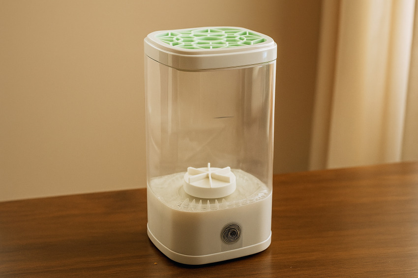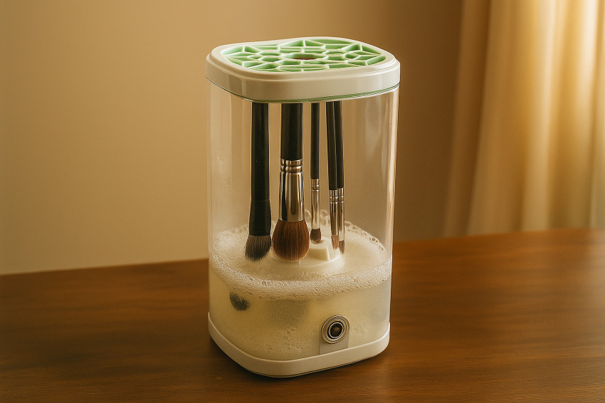 براش داخل محفظه قرار می‌گیره و با چرخش خودکار، مواد آرایشی از بین می‌ره.